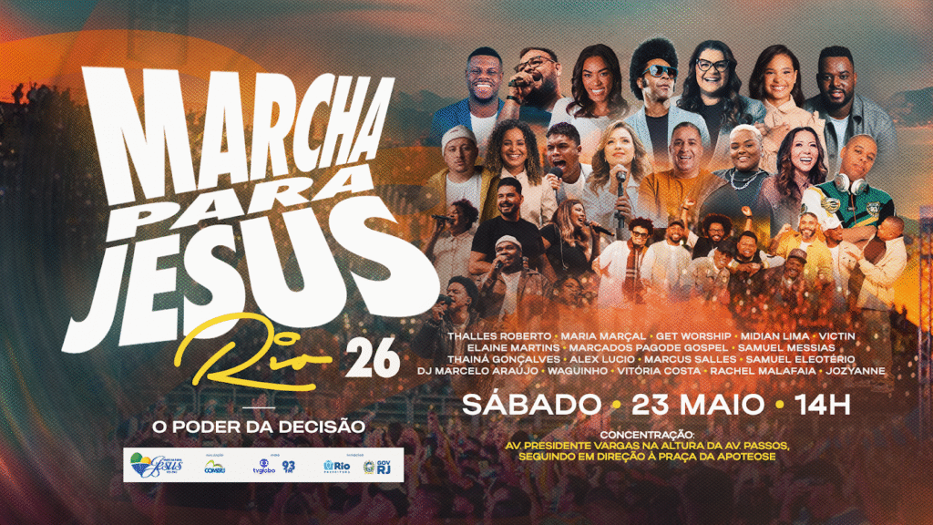 A 19ª edição da Marcha para Jesus do Rio de Janeiro está confirmada para o dia 23 de maio (sábado), a partir das 14h. Parte do calendário oficial da cidade, o evento terá sua tradicional concentração na Avenida Presidente Vargas, na altura da Avenida Passos, de onde seguirá até a Praça da Apoteose, onde grandes nomes da música gospel vão se revezar no palco durante as mais de oito horas de louvor e adoração.