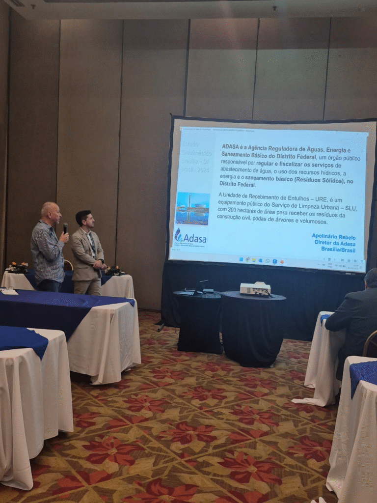 A Adasa esteve representada pelo diretor Apolinário Rebelo, pela superintendente de Resíduos Sólidos Élen Dânia Santos e pelo regulador de serviços públicos Danilo Bijos que participaram das atividades técnicas e apresentaram o artigo científico intitulado “Análise Descritiva da Composição Gravimétrica dos Resíduos Destinados à Unidade de Recebimento de Entulhos (URE)”.