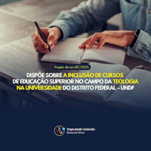 O Deputado Iolando apresentou o PL 637/2023 que dispõe sobre a Inclusão de cursos de educação superior no campo da teologia na UNDF. Confira! 7 de novembro de 2023