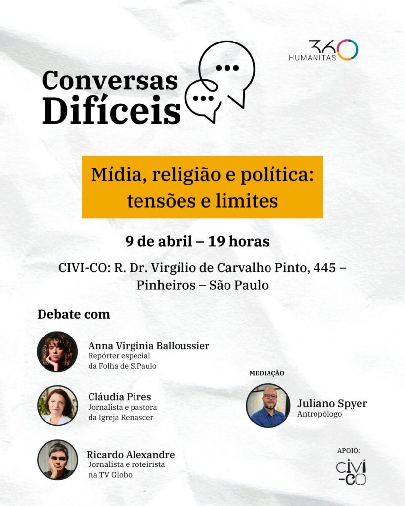 A décima edição do Conversas Difíceis propõe uma pergunta direta: quais são as limitações do jornalismo atual para cobrir temas relacionados à religião, ao cristianismo e a política? O novo encontro, parte da série dedebates promovida pelo Instituto Humanitas360, está marcado para o dia 9 de abril, às 19h, no Espaço CIVI-CO, em Pinheiros, em São Paulo.
