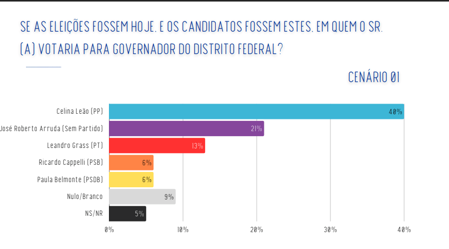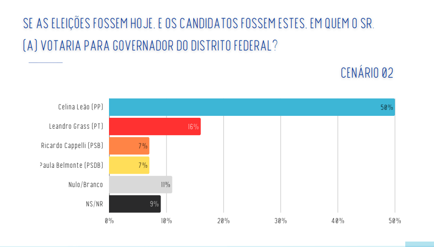 No cenário estimulado, Celina Leão aparece com 40% das intenções de voto, mais que o dobro do segundo colocado. Em um segundo cenário, onde seu principal adversário muda, Celina chega a 50%, mostrando que seu nome se mantém firme independentemente da composição do quadro eleitoral. Esses números mostram que a população reconhece seu trabalho e confia na continuidade das políticas que vêm sendo implementadas no DF.