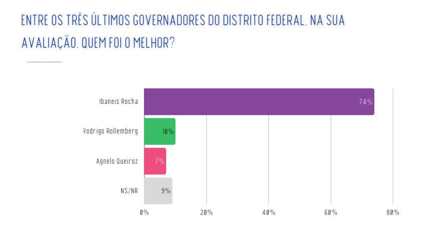 Outro ponto que reforça a força de Ibaneis perante o eleitorado é a avaliação de governo. Segundo o levantamento, 63% aprovam a gestão atual do Governo do Distrito Federal, e Ibaneis é considerado o melhor governador entre os últimos três, alcançando impressionantes 74% das menções dos entrevistados. Uma aprovação expressiva como essa naturalmente se reflete em competitividade eleitoral.