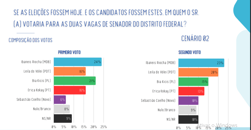 No Senado, o movimento é igualmente expressivo. Em múltiplos cenários apresentados pela pesquisa, Ibaneis Rocha aparece sempre entre os nomes mais citados, ocupando o segundo lugar no cenário principal, com 21% no voto consolidado, desempenho sólido e competitivo, especialmente considerando que serão duas vagas em disputa. Em cenários alternativos, Ibaneis oscila entre 19% e 24%, sempre entre os líderes.