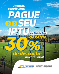Prefeitura de Cidade Ocidental oferece desconto no IPTU para quem paga até junho. 14 de junho de 2025