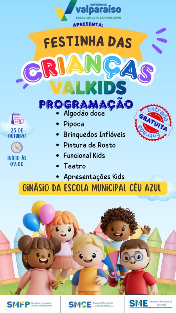No mês de outubro é comemorado o dia delas, das crianças. E para celebrar essa data tão especial, a Prefeitura de Valparaíso de Goiás preparou uma programação repleta de alegria, brincadeiras e momentos inesquecíveis. No próximo dia 25 de outubro, o Ginásio da Escola Municipal do Céu Azul será palco da Festinha das Crianças – Val Kids, um evento feito especialmente para a garotada e suas famílias.