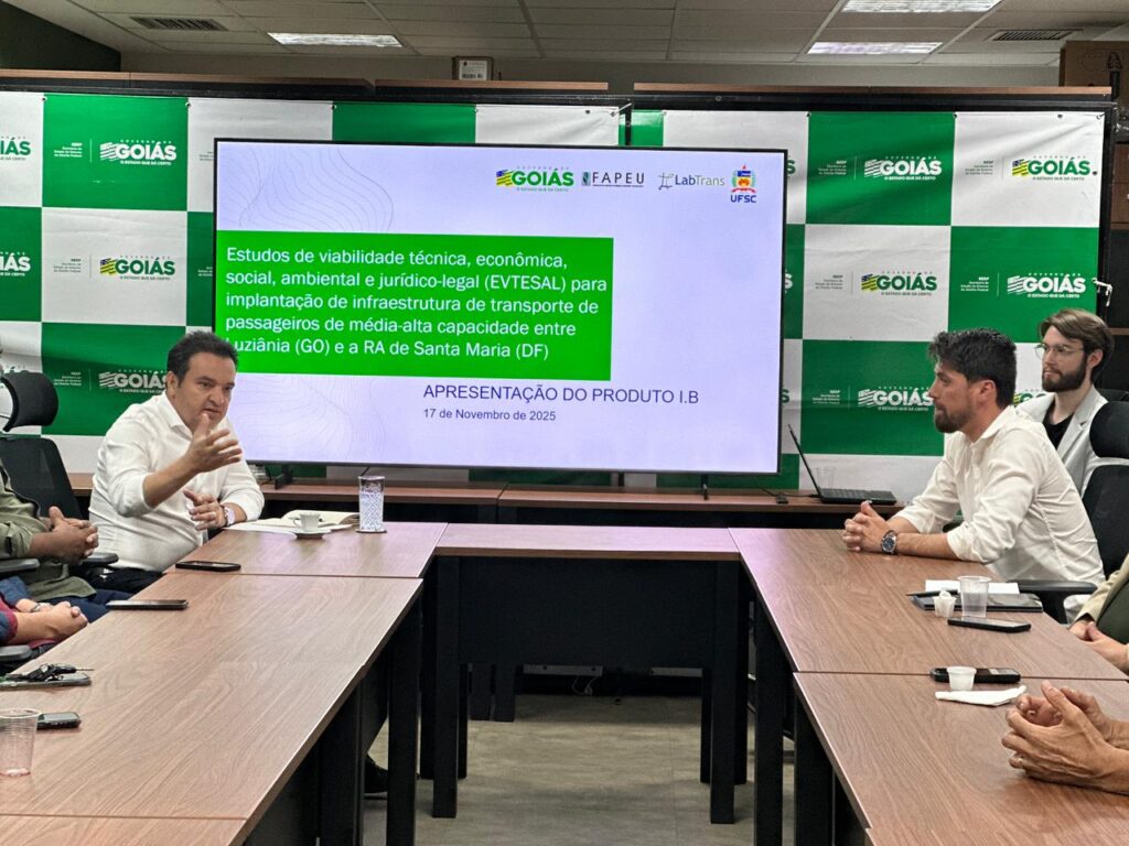 A mobilidade no Entorno voltou à pauta nesta segunda-feira (17/11), durante apresentação técnica realizada na Secretaria de Estado do Entorno do DF, do governo de Goiás (SEDF-GO). O secretário Pábio Mossoró recebeu a equipe do Laboratório de Transportes da Universidade Federal de Santa Catarina (LabTrans/UFSC) e gestores municipais para detalhar a segunda fase do estudo que dará base à implantação de um novo sistema de transporte de média-alta capacidade entre Luziânia (GO) e Santa Maria (DF).