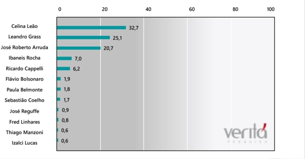 Em segundo lugar está Leandro Grass, com 25,1%, seguido por José Roberto Arruda, que registra 20,7%. Apesar de aparecer no levantamento, Arruda encontra-se inelegível conforme decisões da Justiça Eleitoral.