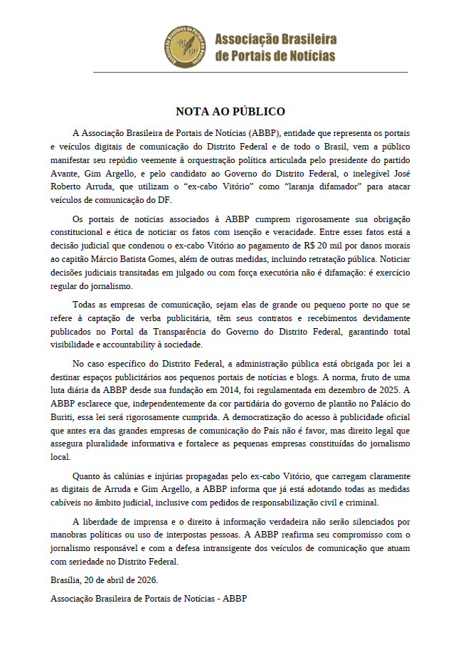 A Associação Brasileira de Portais de Notícias divulgou nota pública em que manifesta repúdio ao que classificou como ataques direcionados a veículos digitais de comunicação do Distrito Federal. No texto, a entidade afirma que os portais associados atuam dentro dos princípios constitucionais da liberdade de imprensa, do direito à informação e do compromisso com a veracidade dos fatos.