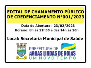 Prefeitura de Águas Lindas abre cadastramento para efeitos de credenciamento de pessoas físicas e jurídicas que atuarão junto à Secretaria Municipal de Saúde e Programas de Saúde 22 de fevereiro de 2023