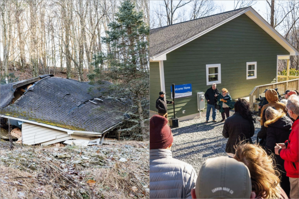 Após meses de busca por uma nova propriedade, o casal recebeu ajuda da Samaritan’s Purse, que iniciou a construção de uma nova casa. A entrega do imóvel ocorreu entre o Dia de Ação de Graças e o Natal, com a presença de amigos e familiares.